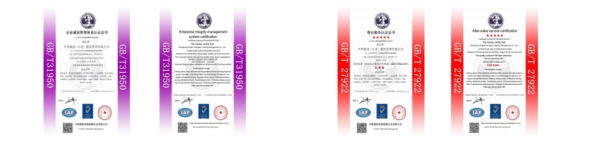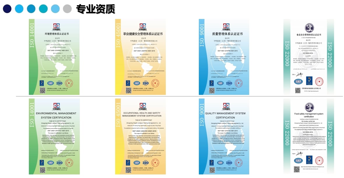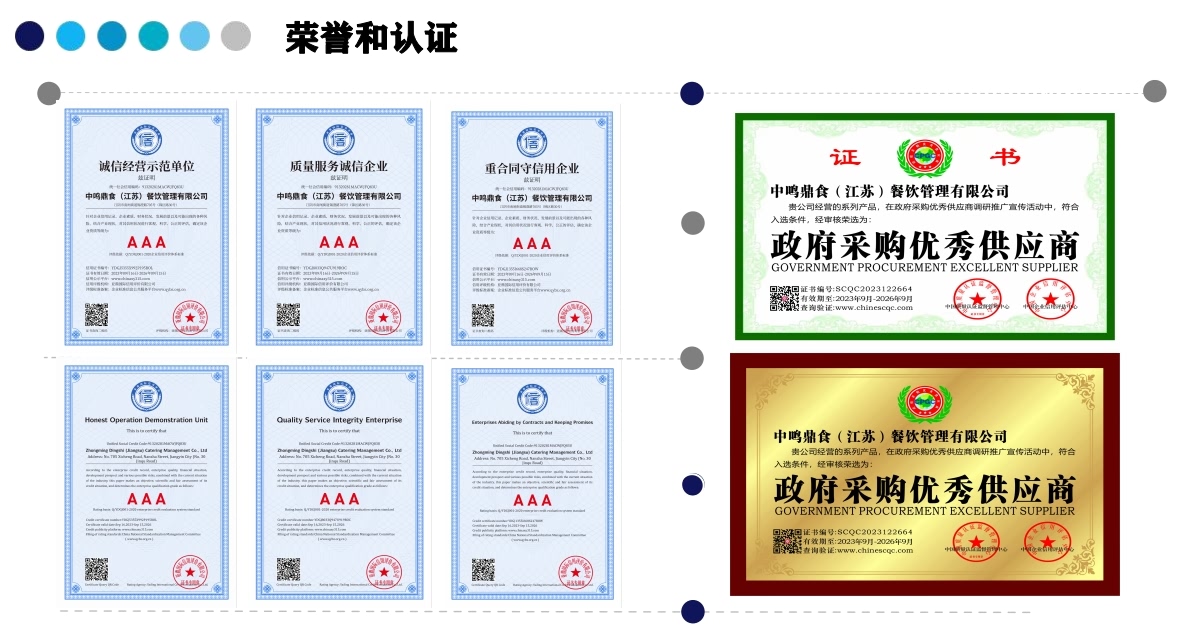 中鸣鼎食(江苏)餐饮管理有限公司是中国团餐业品质企业。主要经营企事业单位食堂承包管理、农副食品配送、单位物业服务。是中国人民解放军部队饮食保障社会化供应单位,也是江苏餐饮协会理事单位、江阴市烹饪协会理事单位、江阴食安南闸分会副会长单位。公司不断推行规范化、标准化和智能化管理。公司日益稳定健康发展,品牌影响力不断扩大,社会地位不断提升,得到了客户和行业的肯定与认可,并实现“明厨亮灶”、“农田到餐桌”、“4D 5S标准”的优质服务。目前公司服务的大众医药集团、南农高科技股份有限公司、中国中车、浙商银行、恒丰银行等二十几家单位,均对我公司的服务表示认可。